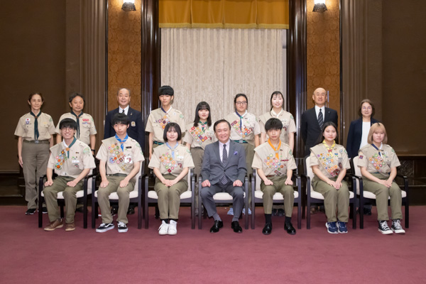 本日の訪問を記念して、受章スカウトの皆さんと記念撮影を行いました。この受章を励みとしてますますご活躍いただきたいと思います。