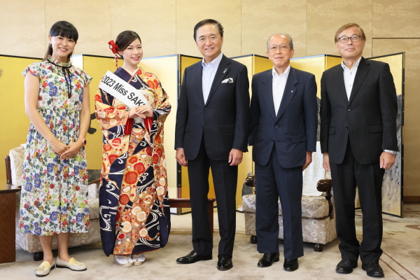 最後に、同席いただいた神奈川県酒造組合、一般社団法人MissSAKEの皆様と一緒に記念撮影を行いました。(左から一般社団法人MissSAKE事務局、2023MissSAKEJapan、私、神奈川県酒造組合会長、同事務局長)MissSAKEJapanとしての山田さんのこれからの国内外でのご活躍を期待しています。