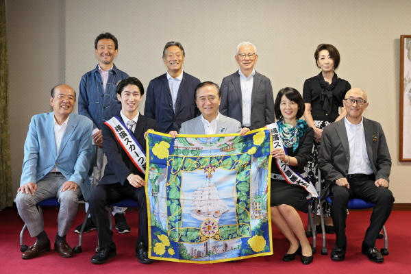 横浜の代表的な地場産品である横浜スカーフの魅力を伝えるために任命された、横浜スカーフ親善大使のお二人が県庁へお越しくださいました。(左から11代目横浜スカーフ親善大使渡辺さん、私、11代目横浜スカーフ親善大使麻生さん)