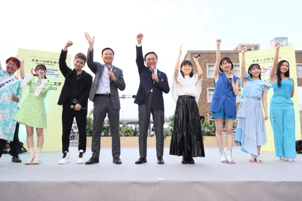 その後日越外交関係樹立50周年を記念し、アンバサダーの川嶋あいさんが制作された日越友好ソング「絆」を、全員で歌ってフェスタを締めくくりました。ステージには、アンバサダーの川嶋あいさん、スペシャルサポーターの武藤彩未さん、kolmeさんにも御登壇いただき、日越外交関係樹立50周年を祝福するにふさわしい、華やかなフィナーレとなりました。