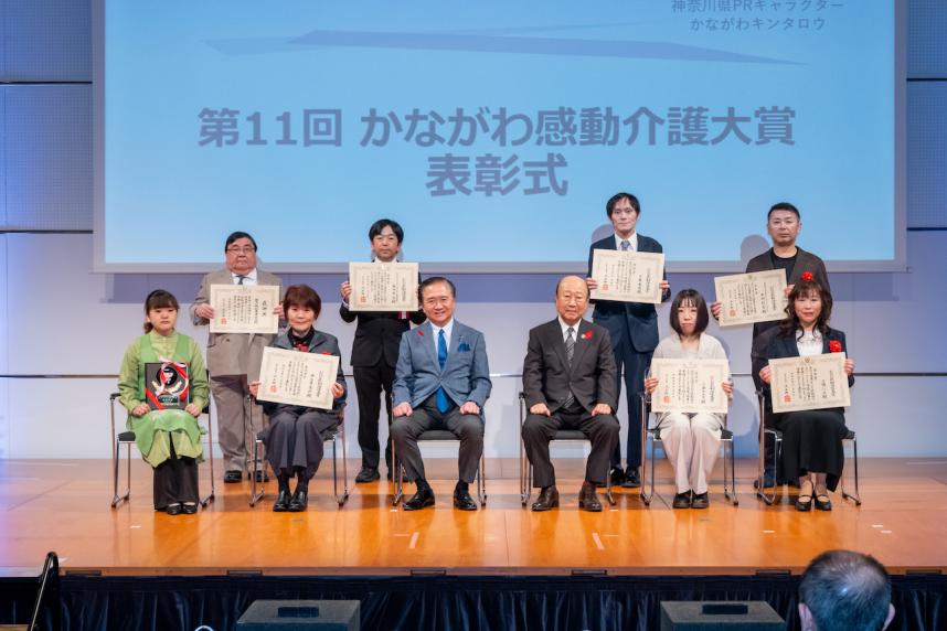 介護フェアでは、介護現場の第一線で働く介護職員や介護に頑張る事業所を応援するため、「かながわ認証」や「かながわベスト介護セレクト20」、「かながわ感動介護大賞」の表彰式等を行い、私から受賞者の皆さんに表彰状を授与しました。