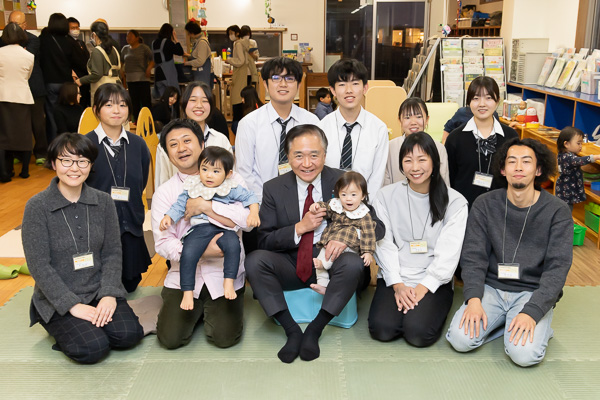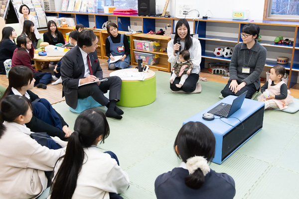本日は、港北区地域子育て支援拠点どろっぷで行われた、県立港北高等学校の生徒の皆さんの「乳幼児ふれあい体験」を見学しました。18名の生徒が参加し、赤ちゃんを抱っこしたり、3歳くらいの子どもと遊んだりしていて、子どもにも、生徒の皆さんにも、笑顔が溢れていました。