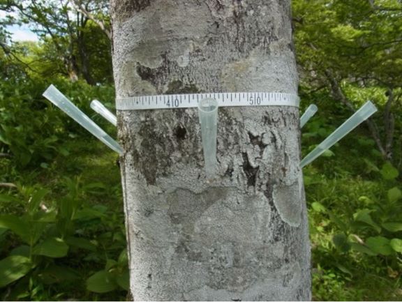 現存するブナを保全するためには、ブナハバチの大量発生時に防除を実施することで葉食被害を回避・軽減し、立ち枯れを防止してこれ以上ギャップが拡大しないようにする必要があります。そこで、ブナハバチ防除事業の実施に向けて、発生予察と大量発生予測時の緊急防除による防除体系を確立しました。発生予察としては、ブナハバチが土中に形成した繭で越冬し、羽化したメス成虫がブナの展開途中の若葉に産卵する生態を踏まえ、繭の蓄積量による発生ポテンシャル評価とブナ展葉・成虫発生・卵密度の事前予測および密度調査を組み合わせた予測手法を開発しました。防除法としては、葉の摂食後に一旦落下し樹幹をよじ登る幼虫を粘着シートで捕獲する手法や、薬剤を樹幹に注入して葉に到達した薬剤で幼虫を防除する樹幹注入法などを開発しました。