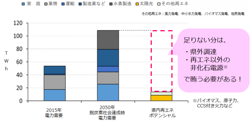 この足りない分の電力については、県域外から再エネ電力を調達するか、発電時に発生する二酸化炭素を回収・貯留する技術(CCS)と組み合わせた電源から調達する必要があります。