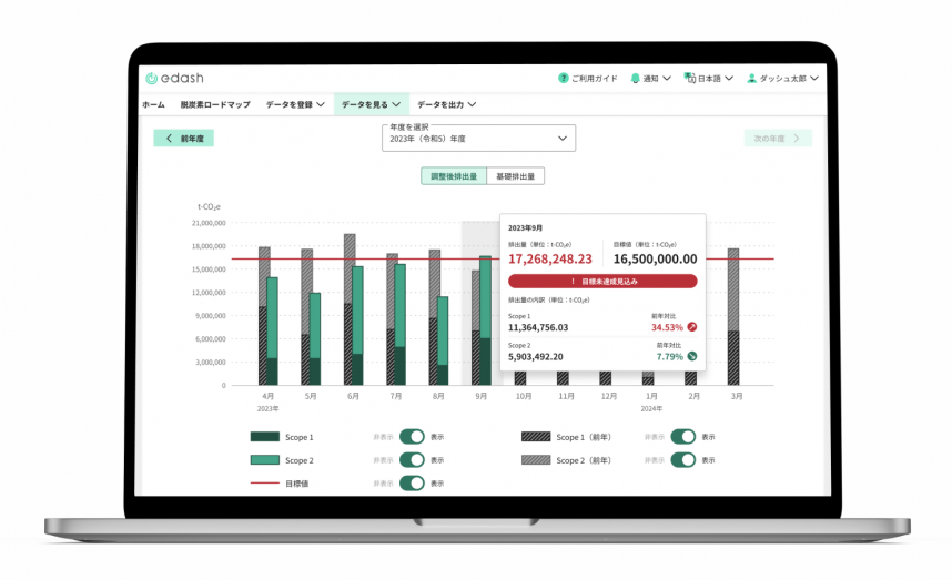 ・Scope3※1排出量の算定 ・Scope3一次データ等の収集機能 e-dash Survey ・電力EMS機能 e-dash real-time(デバイスの設置によりリアルタイムに電力使用量データを取得) |