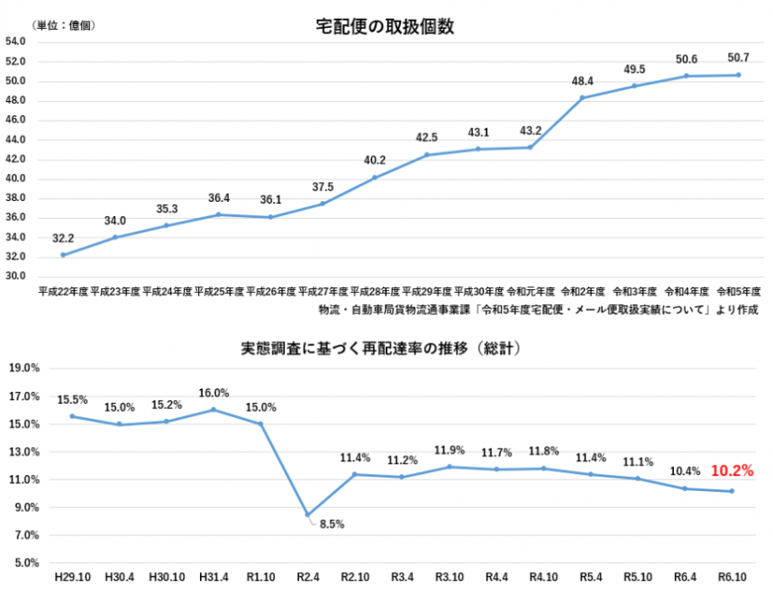 令和5年度の宅配便取扱個数は約50億個に上っており、国土交通省の調査によると、令和6年度10月調査では、宅配便の約10.2%が再配達になっています。