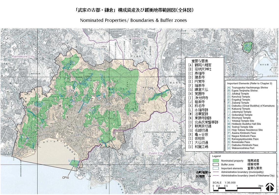 「武家の古都・鎌倉」の世界遺産登録候補の資産は、武家政権の樹立と政権所在地の整備に決定的影響を与えた要害的地形、なかでも主な地形である三方を取り囲む山稜部と、その内部やそれに接する山裾や谷間などに造られた鶴岡八幡宮、建長寺、鎌倉大仏などの神社及び寺院の境内、それらに含まれる建造物、永福寺跡などの寺院跡、武家館跡である北条氏常盤亭跡、朝夷奈切通、名越切通などの切通及び港跡である和賀江嶋等、国指定の史跡、重要文化財及び国宝などの文化財から成り立っていました。