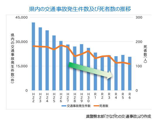 県内の交通事故発生件数と死者数は、減少傾向にありますが、依然として多く、高齢者を含む全ての人が安全・安心に移動できる道路空間を確保していくためには、引き続き、道路交通環境の整備などを進めていくことが必要です。