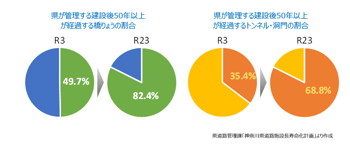 県内では、今後、建設後50年を経過する橋りょうやトンネル等の道路施設が一層増加することが見込まれ、膨大な数の道路施設を適切に維持管理していくためには、老朽化対策を着実に進めることが必要です。 さらに、生産年齢人口が減少していくことが見込まれる中、建設業においても、担い手不足が深刻化しつつあり、重要な社会基盤である道路を、AIをはじめとするデジタル技術も活用し、効率的かつ効果的に維持していくことが必要です。