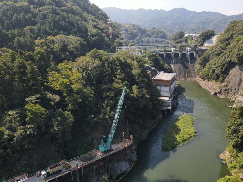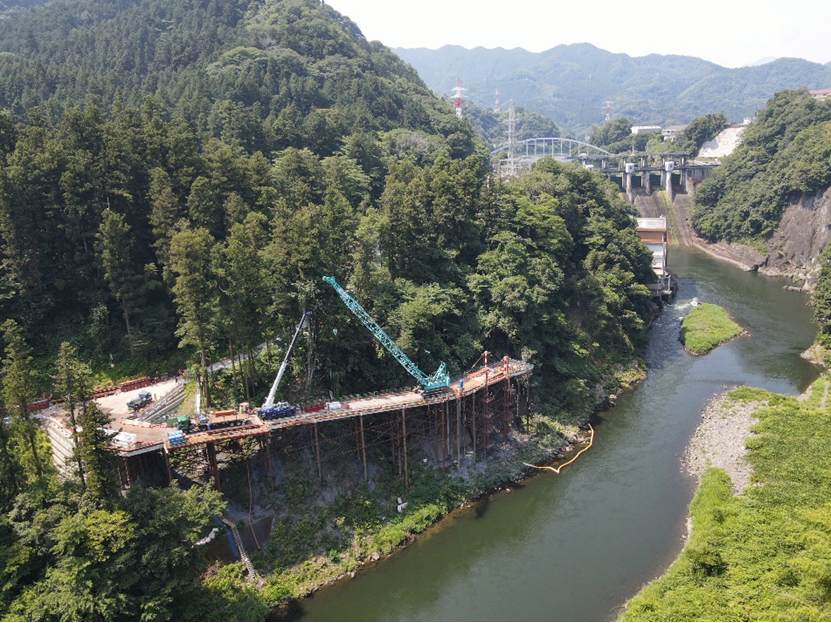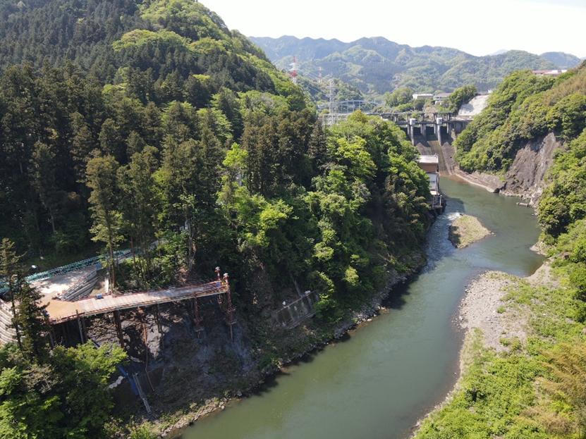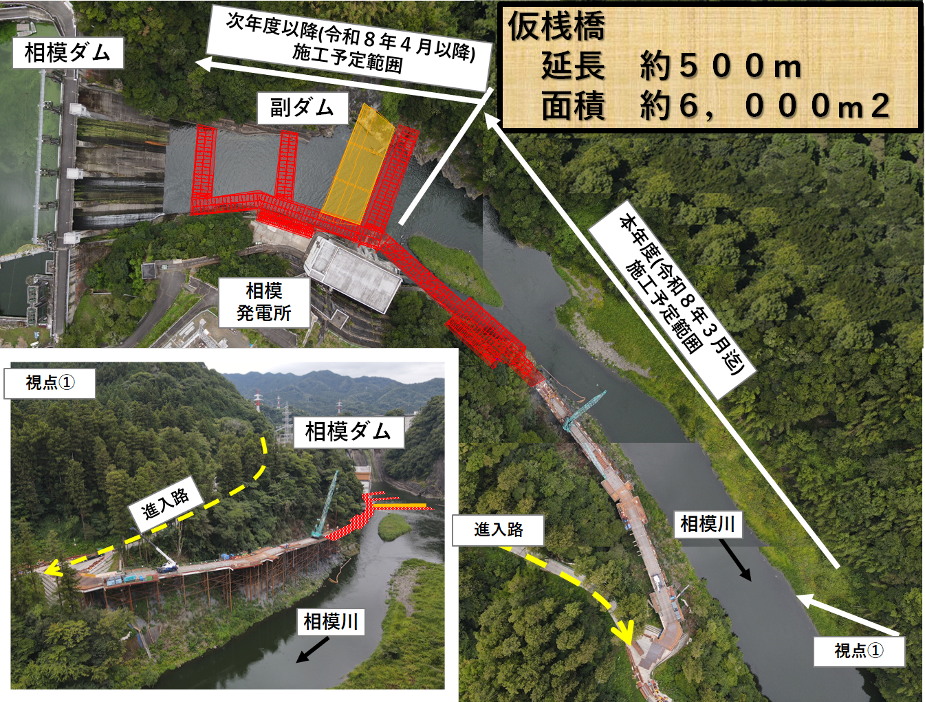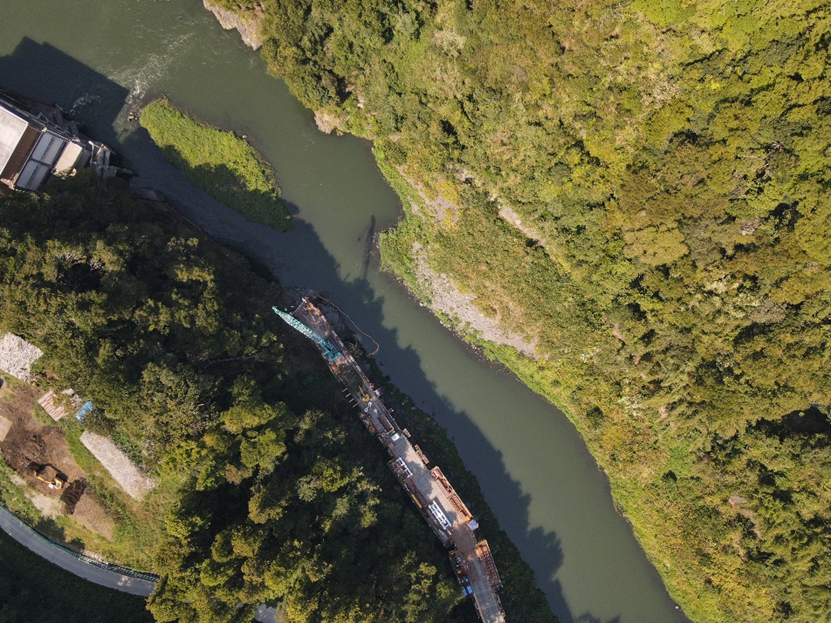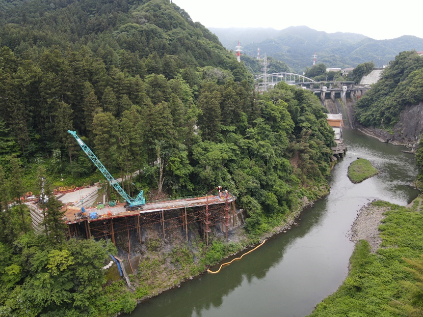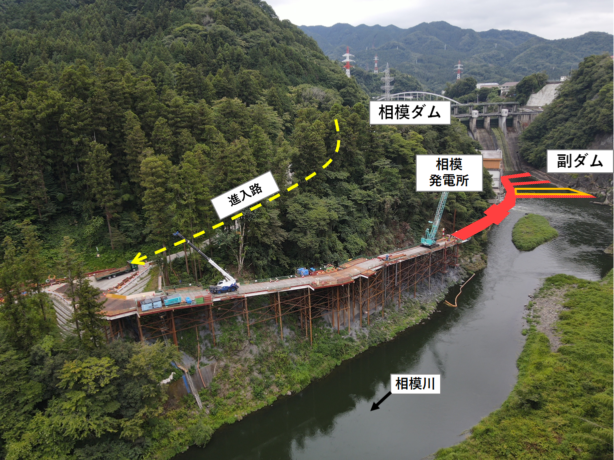 「相模ダムリニューアル工事(第1期)下流施設工事」では、ダム下流に設置した進入路から河道内に仮桟橋の設置を始め、徐々に上流の相模ダムに向かって仮桟橋を伸ばし、河道内から施工場所にアクセスする計画としています。