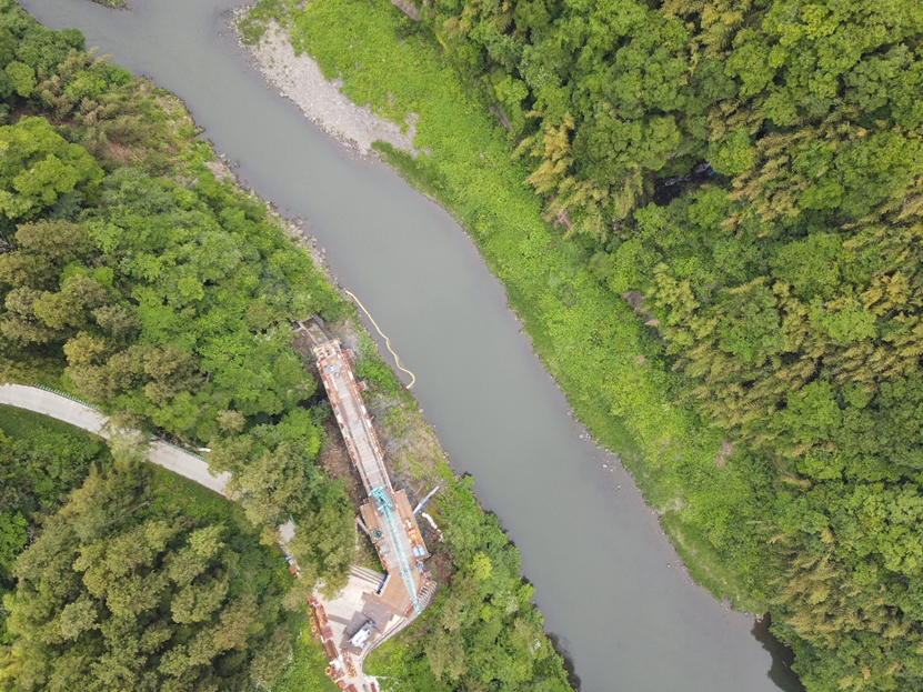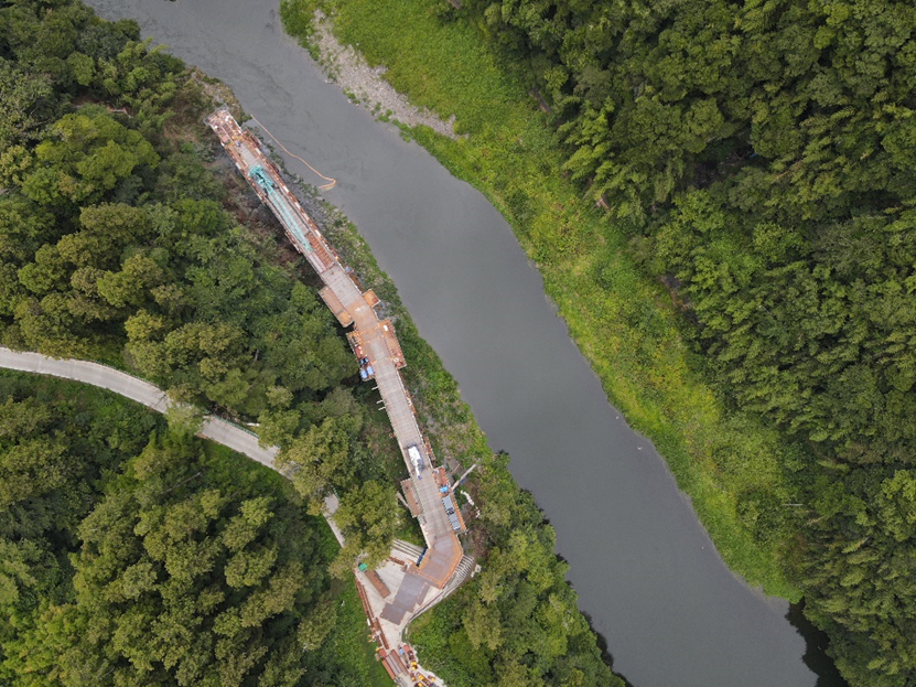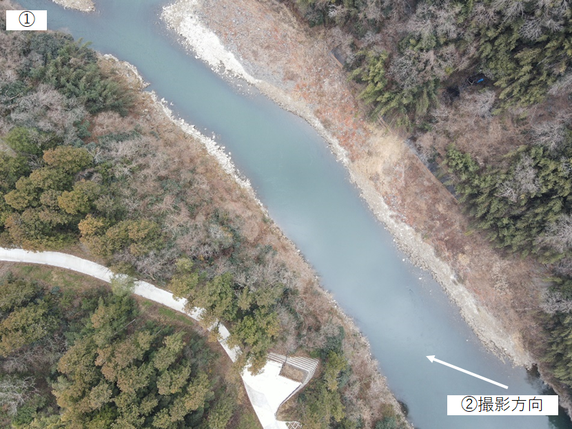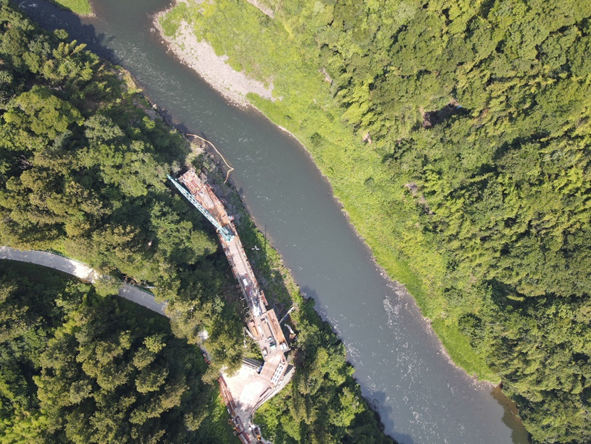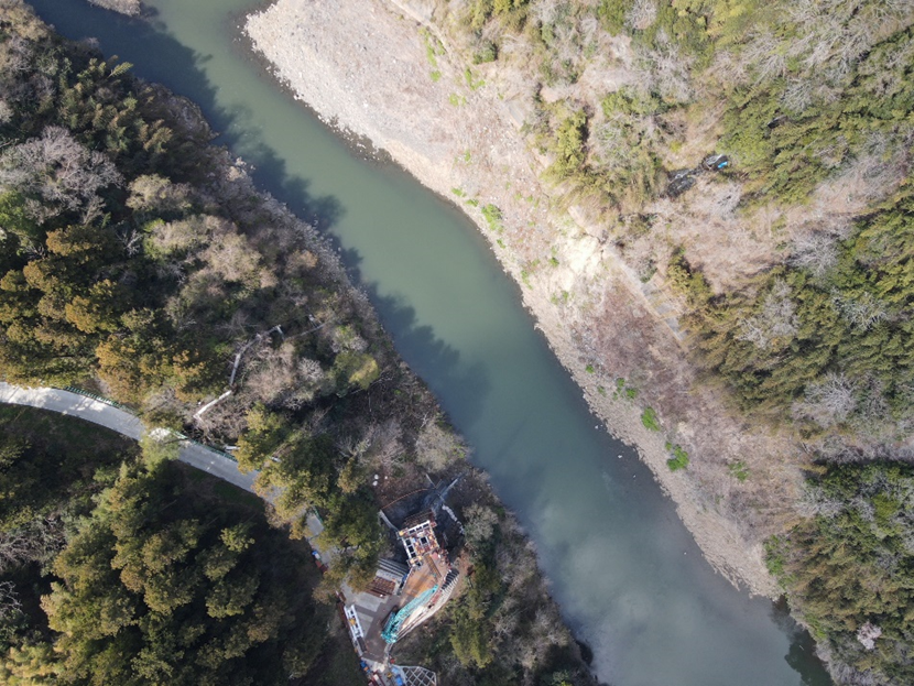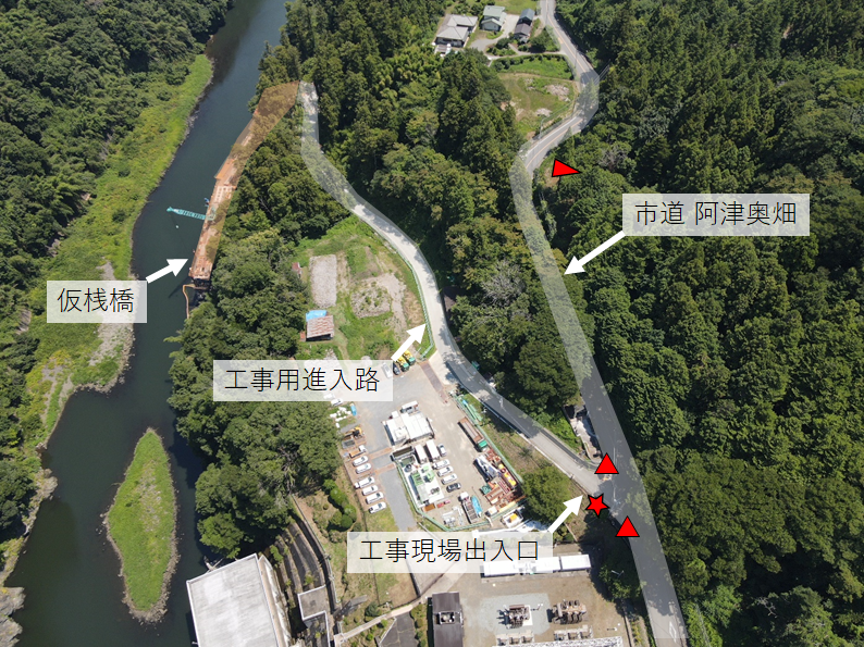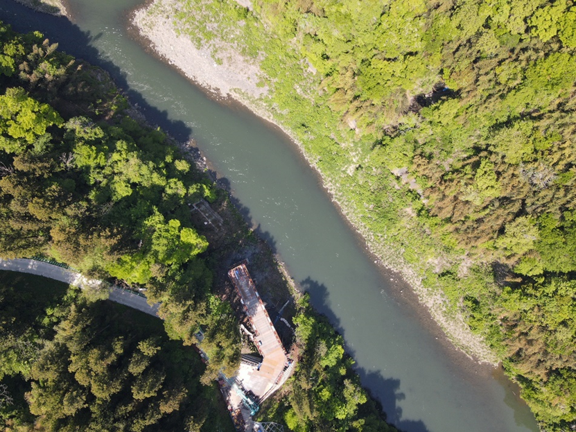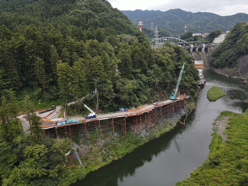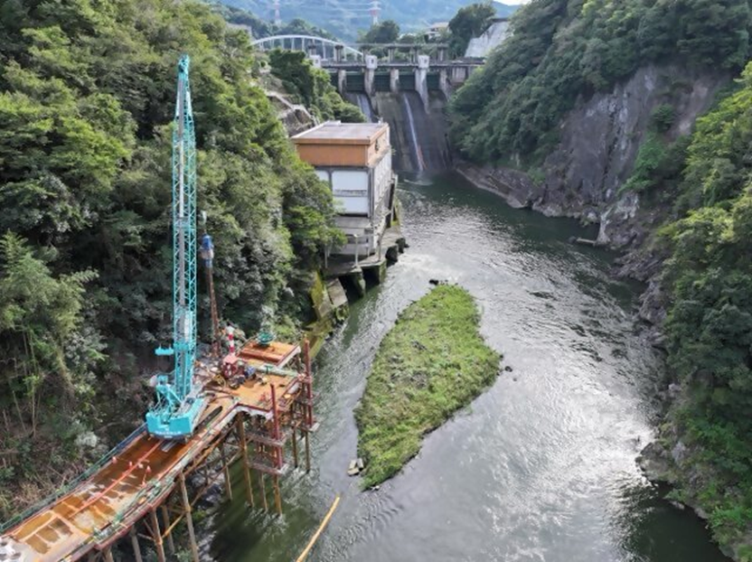 「相模ダムリニューアル工事(第1期)下流施設工事」では、ダム下流に設置した進入路から河道内に仮桟橋の設置を始め、徐々に上流の相模ダムに向かって仮桟橋を伸ばし、河道内から施工場所にアクセスする計画としています。