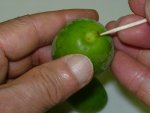 写真:ザルに盛った青ウメ(玉英)1kg   写真:爪楊枝を使って、青ウメの果柄や花殻を取り除く