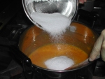 ミカンの下煮が終了したら、分量の砂糖を全部加えますが、一気にザッと加えると鍋底に砂糖がたまり、こびりつき、焦げる原因ともなります。沸騰したミカンを攪拌しながら砂糖を加え、砂糖が鍋底に溜まらないようにサーッと加えて下さい。