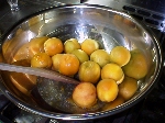 (1)アンズを水洗し、ザルにあげて水をきる。