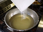写真:鍋に入れるる写真:砂糖を加えて焦がさないように煮詰める