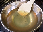 写真:煮詰め具合 漉し液3kgに砂糖1.6kgを加えて煮詰め、全体で2.5kgになると糖分が70%になり、少しトロトロしてきます。さらに2.2kgくらいまで煮詰めると糖度80%になり、ハチミツくらいの粘りになってきます。煮詰め具合はどの様な利用をするのかを考えて、決めて下さい。紅茶に入れるのなら少しサラサラした感じ、ホットケーキシロップとして使うのならハチミツ程度が良いでしょう。