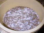 味噌の発酵には乳酸菌と酵母が関与しますが、自家醸造味噌では乳酸菌と酵母を添加していません。高濃度の食塩が含まれた環境でも生育が活発で、良好な風味を醸成する乳酸菌と酵母を添加するため、風味良好に熟成された味噌を種味噌として入れます。種味噌は(9)(10)の蒸煮大豆、麦麹、塩を攪拌混合するときに、100~200g程度入れて下さい。