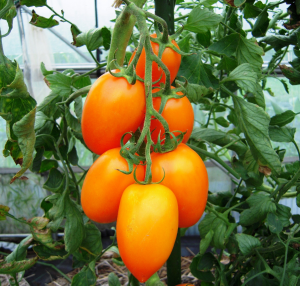 ‘湘南ポモロン・ゴールド’は、果皮色が橙黄色で長円筒形形をしていて、着花数が多く、6から9果程度着果し、果実の揃いも良好です。13から15段収穫では、1株当たり4から6kgの収量が得られます。果肉は黄色で硬く、‘ハウス桃太郎’と比較し、Brixは同等程度で生食用として利用できます。またアミノ酸含量は調理加工用品種と同等程度あり調理加工用にも適しています。