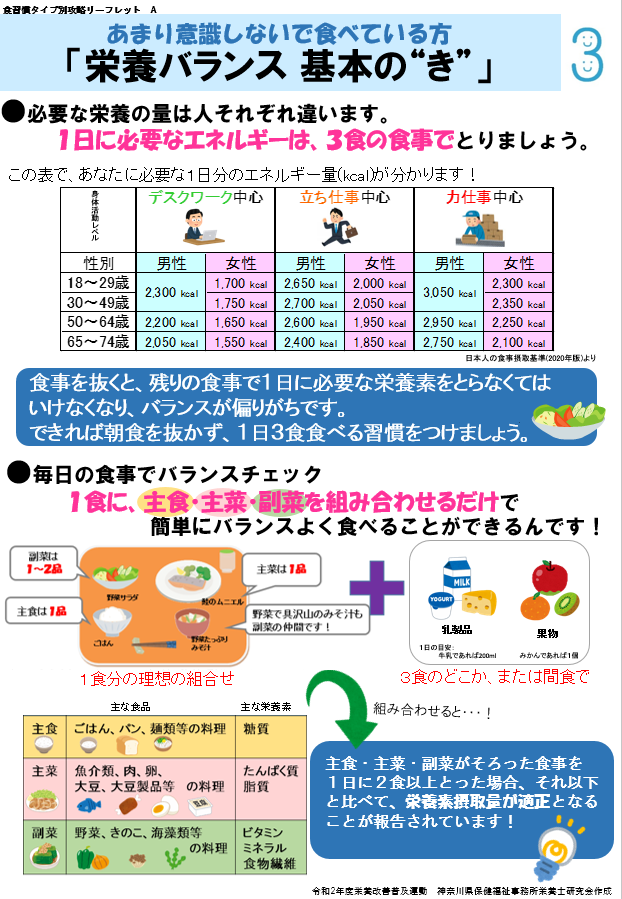 ※これらのツールは、「かながわ健康プラン21(第2次)」における目標で、食生活の基本でもある、“主食・主菜・副菜を組み合わせた食事が1日2回以上の日がほぼ毎日の者の割合の増加”を推進するために、作成したものです。