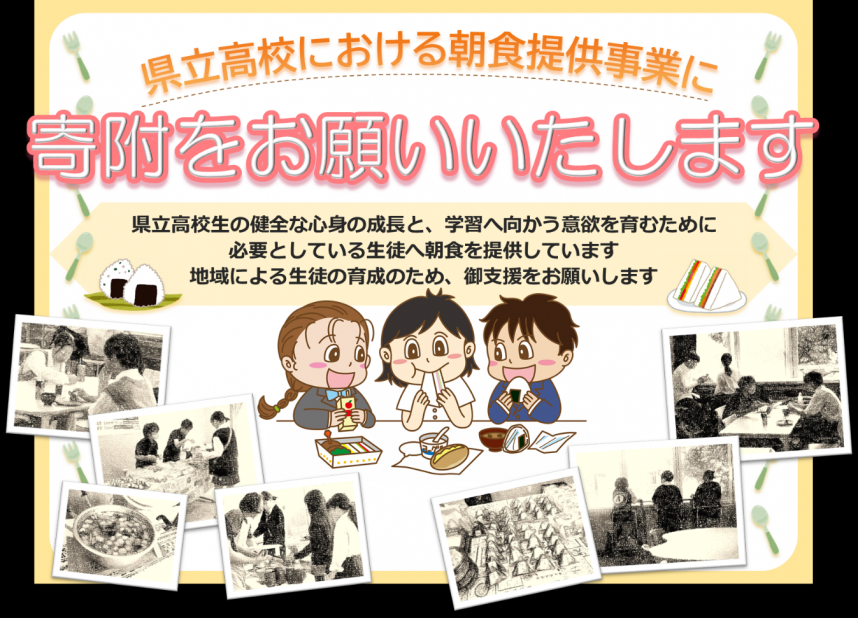 現在、高校教育課では県立高校4校(県立田奈高校、県立大和東高校、県立相模向陽館高校、県立津久井高校)において、週に2回程度、在校生の希望者に対し、NPO法人等の協力のもと朝食を提供する事業に取り組んでいます。