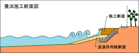 この対策として、相模貯水池や茅ヶ崎漁港西側の堆積土砂等を運搬し、海辺で敷き均す「養浜事業」によって、砂浜を広げ、防護、環境、利用の調和の取れた侵食対策を実施しています。
