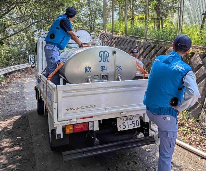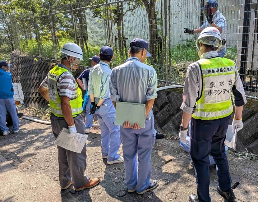 厚木水道営業所では、令和7年8月27日(水曜日)午後、管内の災害用指定配水池(※)の緊急遮断弁が地震により閉止したことを想定し、応急給水の注水拠点となる災害用指定配水池で緊急遮断弁を開ける手順や応急タンクへの注水訓練を企業庁OBと合同で実施し、いざというときに円滑に活動できるよう作業手順の確認と職員のスキルアップを目指し訓練を行いました。