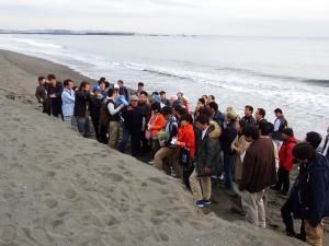 茅ヶ崎海岸柳島地区から中海岸地区までの砂浜を、一般財団法人土木研究センター常務理事の宇多氏から「養浜の効果」、「海浜植生の役割」、「飛砂防止柵の効果」などについて説明を受けながら見学しました。