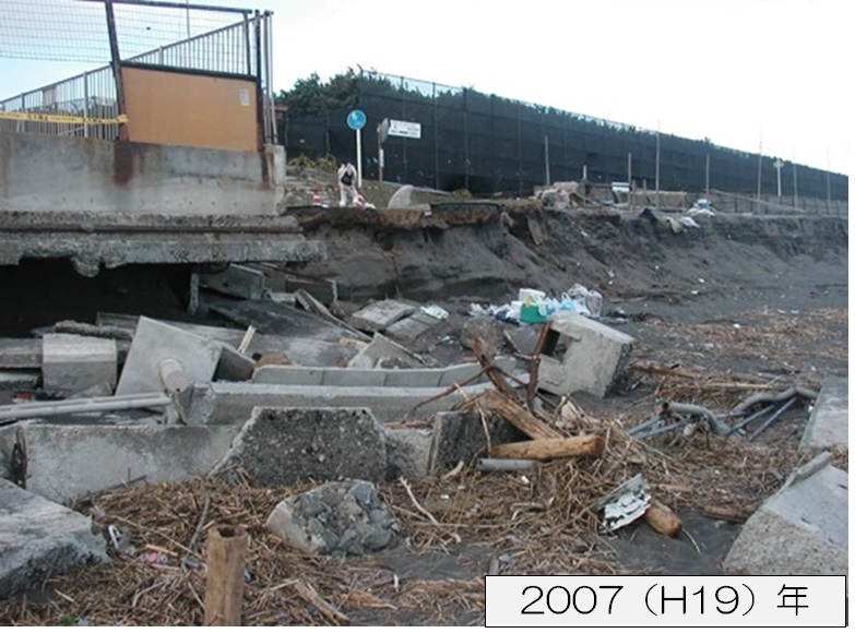茅ケ崎海岸中海岸地区では、海岸侵食により砂浜が50m近く失われ、台風などの高波によって背後の護岸やサイクリングロードが崩壊するなどの被害が生じました。