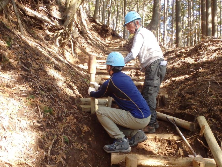 神奈川県自然公園指導員12名とパークレンジャー3名で登山道の補修作業を行いました。