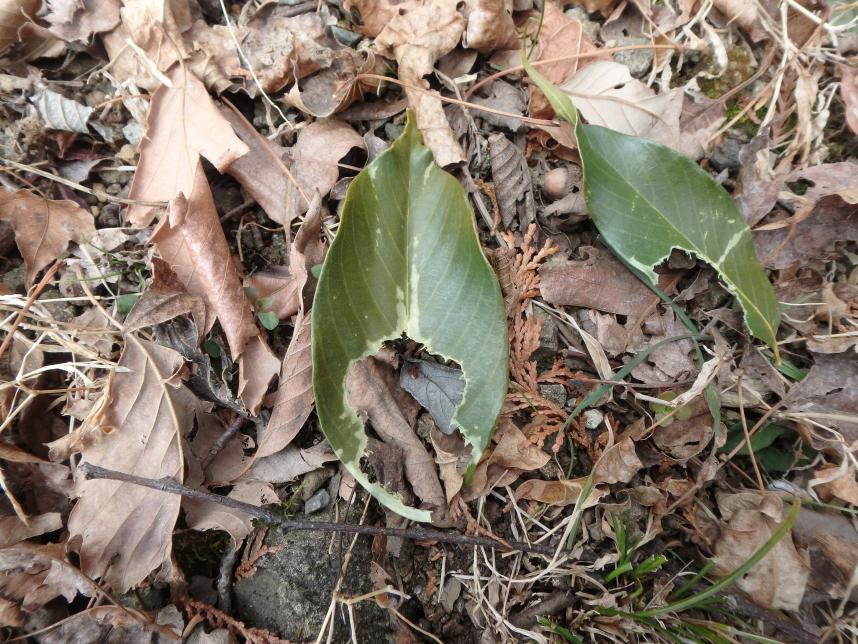 ムササビは葉を二つに折って食べるので、ほぼ左右対称に食べた痕が残ります。