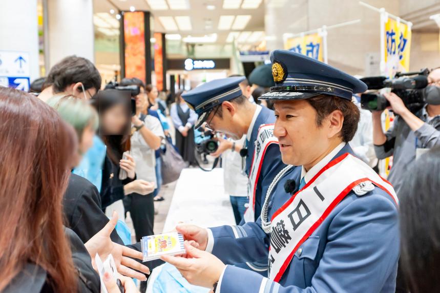 来場の皆さまへジョイマン署長が直接防犯啓発品を配布しました!