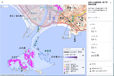 〇被災想定区域における人口、世帯等の把握(例)江の島×土砂災害警戒区域の表示