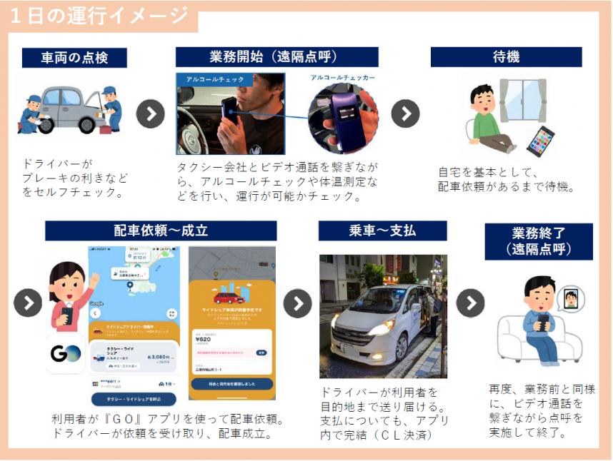 タクシー事業者がこれまでに蓄積してきたノウハウを活かし、ドライバーへの遠隔点呼や運行状況の確認などの運行管理を行うことで、安全・安心な運行を行っています!