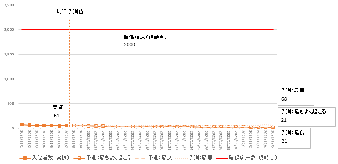 本予測モデルでは、今後28日間に入院治療を必要とする重症者、中等症、軽症だが基礎疾患があるため、入院が必要な者等の数を予測することで、医療ひっ迫の可能性を予め察知し、追加病床確保などの対処を事前に行うものです。