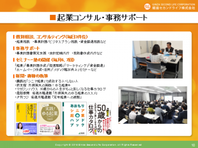 弊社、銀座セカンドライフという会社ですが、セカンドライフという社名にありますように、50代60代を中心とした方へ起業支援をしている会社です。主に定年前後での起業支援です。