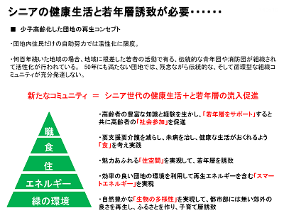 ですから、それを何としても活性化するには、まず高齢者の健康ですね。あと若い人たちを何とかして団地の中に呼び込んでいこうということが必要になります。