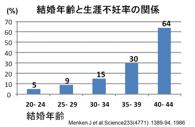 そこで、3つに分けてお話しします。この図は、結婚年齢と生涯不妊率の関係を示した図です。女性が若いときに結婚されると、生涯子どもを持てない率はすごく少ないのです。5%くらいです。ところが年齢を重ねるに連れてどんどん妊娠できない可能性が増えてきます。このことが「Science」(サイエンス)という立派な雑誌で発表されています。