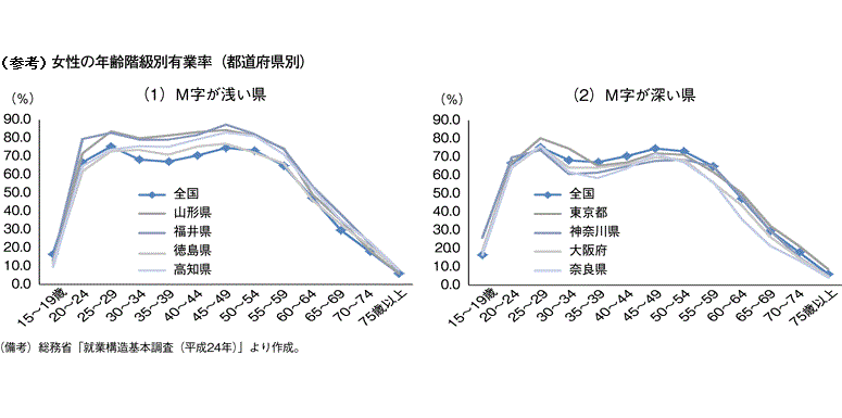 M字カーブというのがありましてね、女性が何歳のときにどれだけ働いているかということですね。そうすると、若いうちは学校を出てすぐ働くんですね。その人たちが結婚とか出産を機にいったん仕事を離れるんですね。子育てが一段落すると、また仕事に戻って来たりと。ということでこれMのような形になるんですけれども、これが神奈川県の場合にはこの落ち込みが深いんですね。非常に大きな問題ですね。