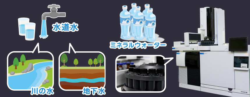 水中のトリハロメタン、カビ臭物質、農薬、医薬品類などを測定できる「ガスクロマトグラフ/質量分析計(GC/MS)」により、水道水や水道水のもとになる川の水や地下水、ミネラルウォーターが安全であることを確認しています。