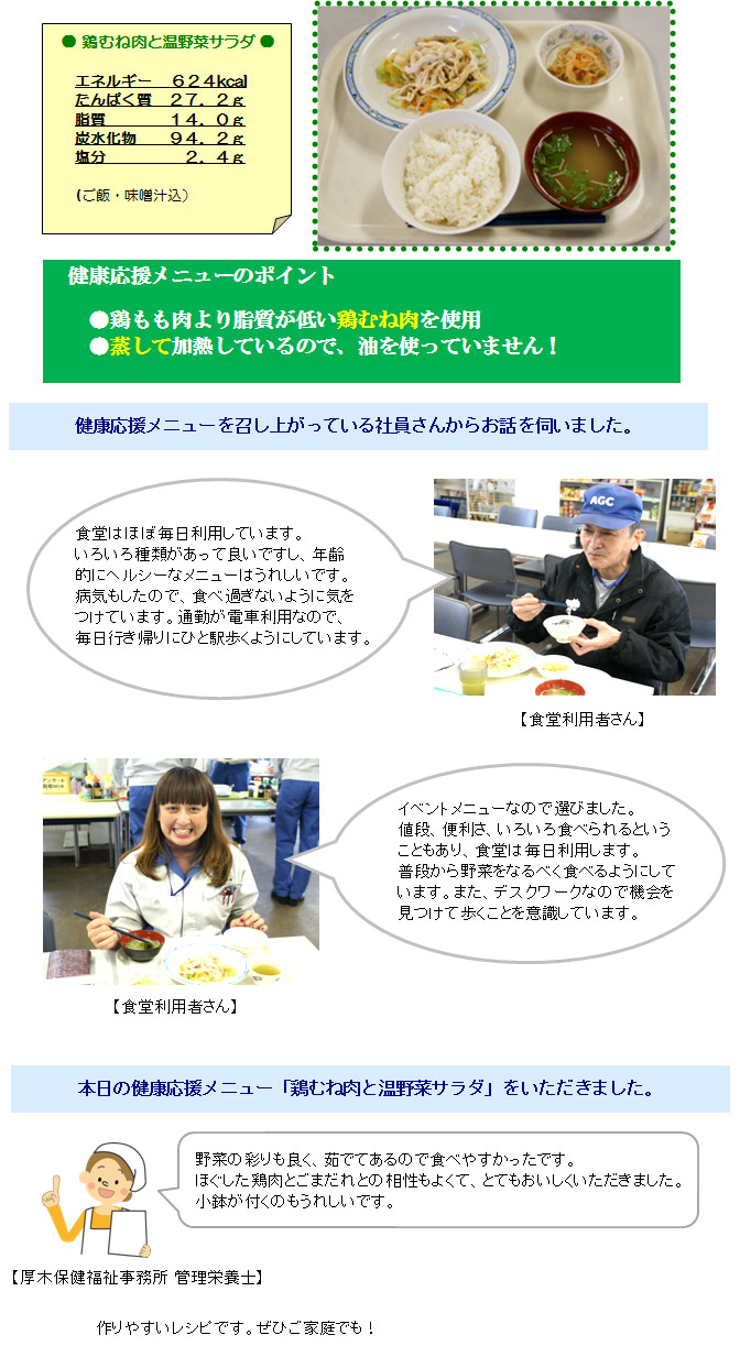 神奈川県厚木地区の社員食堂で社食を社員の健康づくりに生かしている事業所を紹介するページ