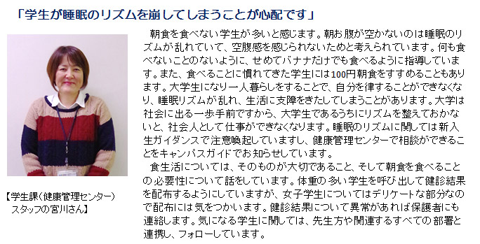 今回取材に応じてくださったのは、生協理事長の大学准教授 森山先生と学生課(健康管理センター)スタッフの宮川さんです。