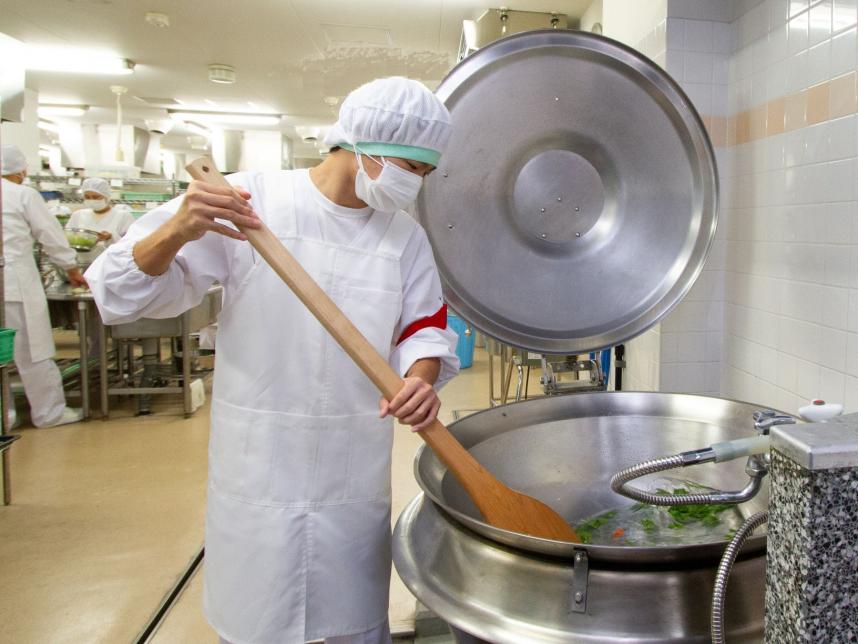 A.給食調理は大量の食事を限られた時間内で調理し、一斉においしい食事を衛生的に提供することを要求されます。そのためには、食品衛生などの正しい知識や調理におけるスピード、段取り力の他に、チームワーク力が重視されます。また、立ち仕事であるため、体力、健康管理が必要です。