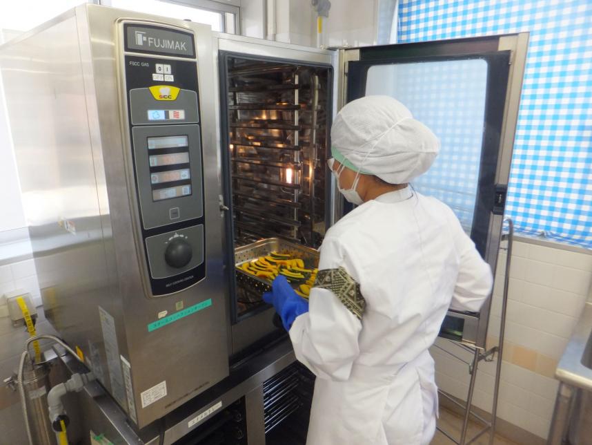 技術校では、包丁の使い方、計量、野菜の洗い方、煮る・焼くなどの調理技術、盛り付け、給食調理で使われる機器(コンビオーブン、回転釜、フライヤー等)の使い方を学び実習、大量調理(100食程度)を通じて習得します。