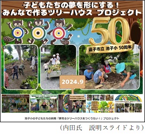 「夢見るツリーハウスプロジェクト」を本校では行っています。これは、子どもたちが池子小学校をよりよくするために何ができるかを考えたときに、「遊具がもっと欲しい」という意見が出てきたことがきっかけです。その遊具をどのように作っていくかを、子どもたちが絵にしたり言葉にしたりしました。