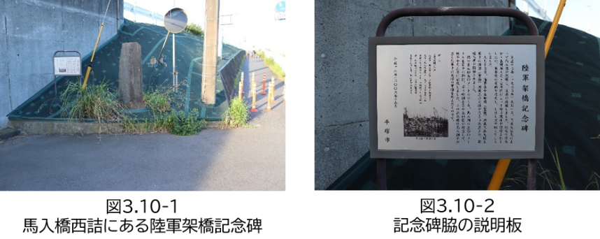 記念碑の正面に「陸軍架橋記念碑」として陸軍が苦労して橋を架けたことが書かれており、その脇に説明板があります(図3.10-2)。説明板には、震災により馬入橋が倒壊したため、地元の消防組員と在郷軍人、青年団によって渡し舟が運行されていましたが、数日間に及ぶ豪雨で舟が流失し、中断していたところ、陸軍の第十五師団(豊橋)と第十六師団(京都)が架橋工事を実施し、橋が完成したことをたたえて建てられた碑であることが書かれています。