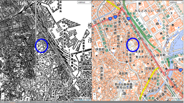 | 位置図(左:震災前後、右:現在) | ||||||