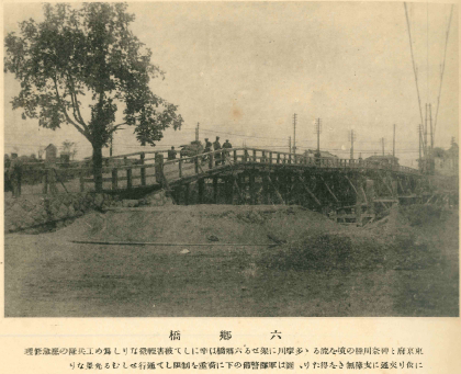 | 原典説明 | 東京府と神奈川県の境を流るゝ多摩川に架せる六郷橋は幸にして被害軽微なりし為め工兵隊の応急修理に依り交通に支障無きを得たり、図は軍隊警備の下に荷重を制限して通行せしむる光景なり | |||||