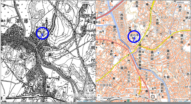 | 位置図(左:震災前後、右:現在) | ||||||