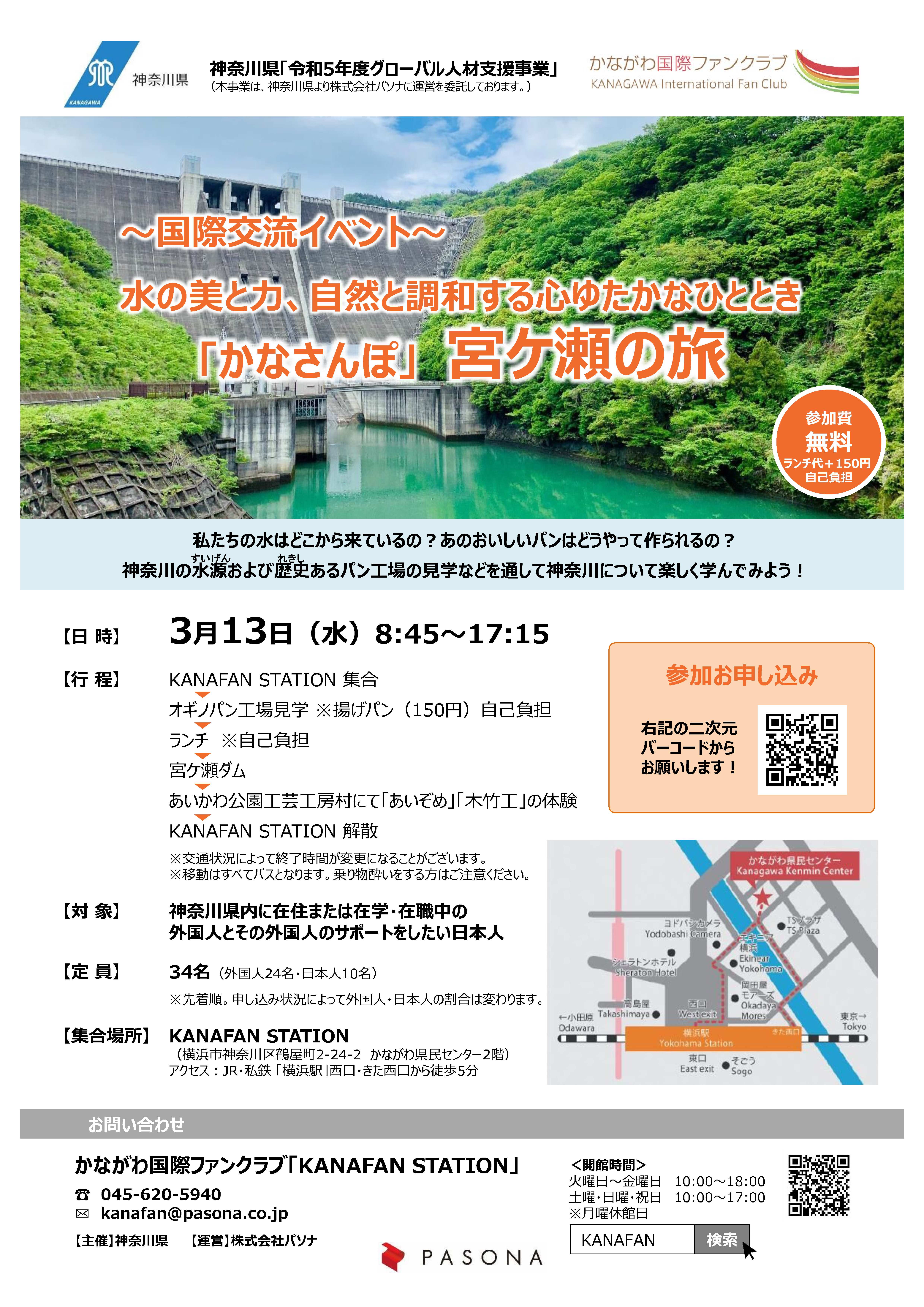 The second “KanaSanpo” of this fiscal year is a one-day bus tour through the Miyagase area, visiting Oginopan factory, Miyagase Dam and Japanese traditional crafts workshop. Enjoy scenery of a Japanese dam and its vicinity, traditional “aizome (indigo dyeing)”, and crafts (and eating, of course!). International students living or studying in Kanagawa Prefecture can join.