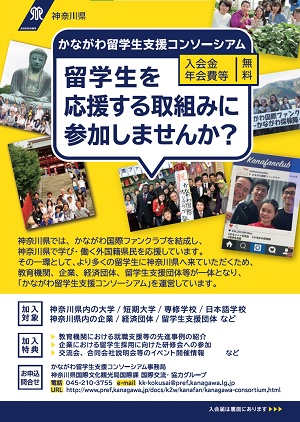 神奈川に留学する学生を応援し、今後より多くの留学生に神奈川に来ていただくため、教育機関、企業、経済団体、留学生支援団体等が一体となり、「かながわ留学生支援コンソーシアム」を運営しています。